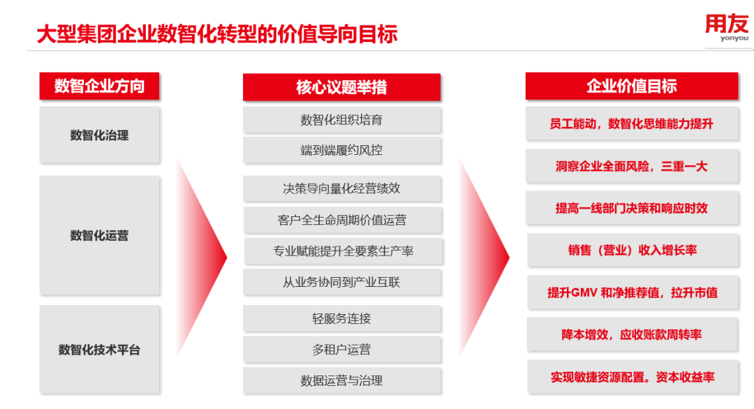 大型企業(yè)數(shù)智化轉型會面對各種聲音,但用友建議企業(yè)要回歸經營本質,從底層的管理邏輯和業(yè)務邏輯出發(fā),定位自身所處的階段,打造與企業(yè)經營管理相匹配的數(shù)智化平臺,從而實現(xiàn)價值創(chuàng)造。