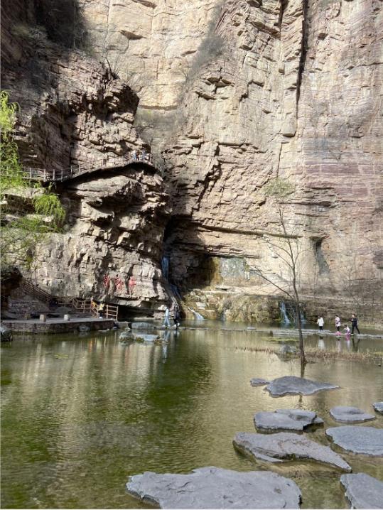 經過一晚上的休息,第二天早上大家精神抖擻的趕到桃花谷景區(qū)。它是以山、谷、潭、洞為主的自然景區(qū)。因其“三九嚴寒桃花開,三伏酷暑水結冰和346米高亞洲高瀑布”而聞名于世。在往景區(qū)深處,隨著指引來到太行天路景區(qū)。太行天路景區(qū)位于太行山之巔,北起桃花谷景區(qū),南至仙霞谷景區(qū),全長約30km,既是景區(qū)環(huán)線游覽道路的重要組成部分,更是俯瞰太行山壯美風光的好位置。乘坐觀光車游走于太行天路,深邃的峽谷、直立的巖壁,帶給我們強烈的視覺震懾。